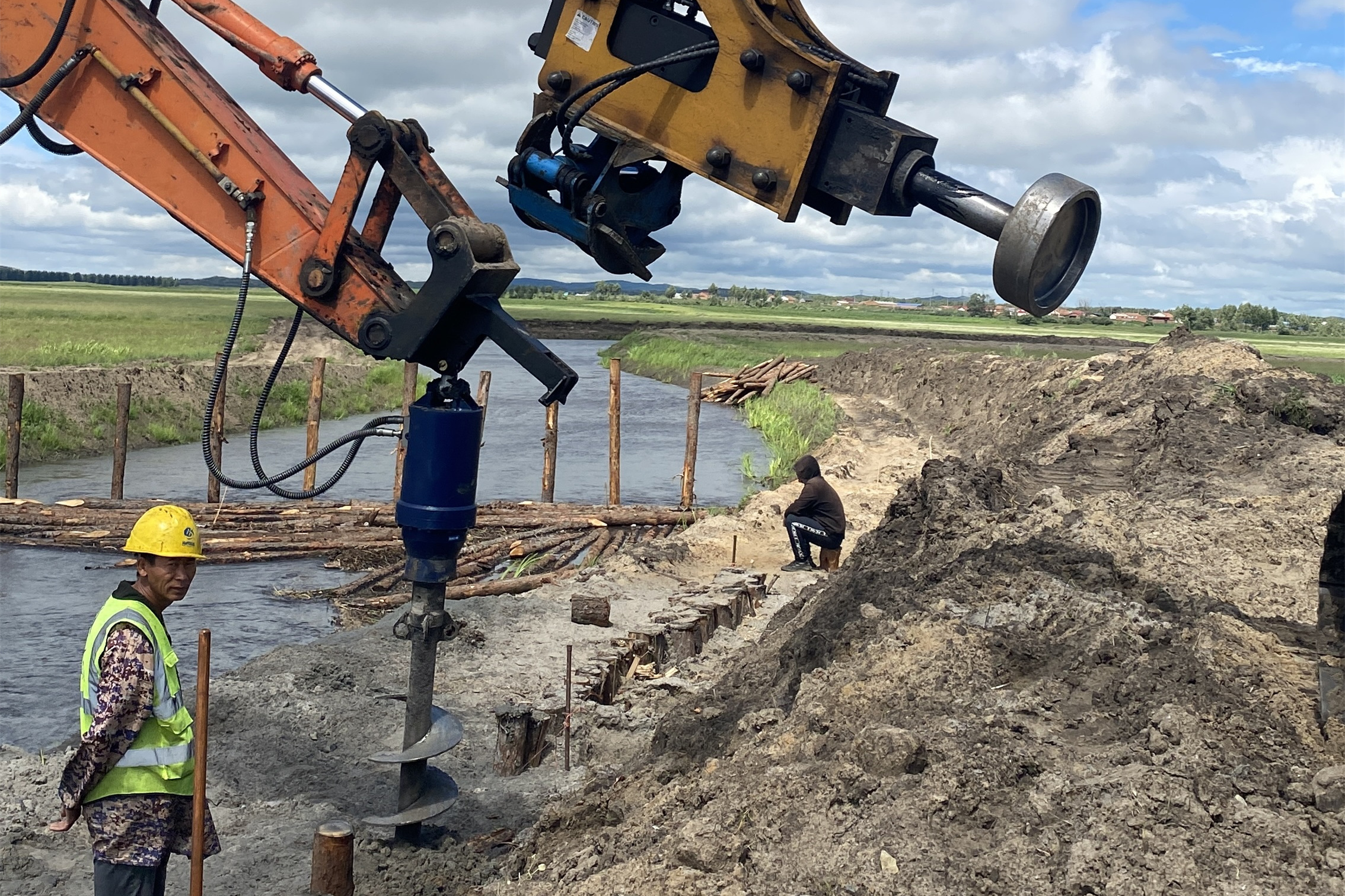 改造魚(yú)塘,堤壩用木樁加固為了穩(wěn)定壩的基礎(chǔ),兩邊用松木樁固定;相對(duì)來(lái)說(shuō)木樁成本較低。